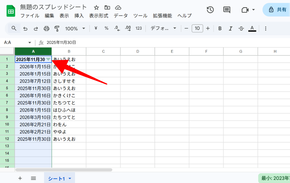 各列の右上に小さな三角マークが表示されます。