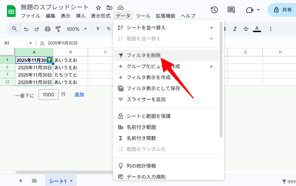 「データ」 → 「フィルターを削除」